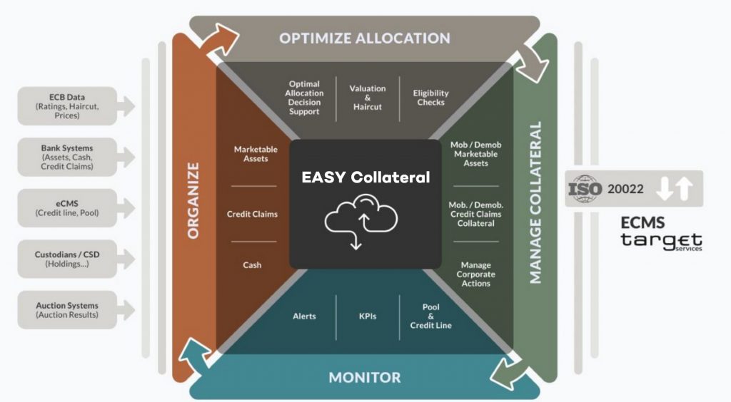 Easy Collateral is a SaaS turnkey solution, specifically designed for bank treasurers to seamlessly integrate with ECMS. It relies on the same parameters used by ECMS for collateral assessment in terms of eligibility, valuation, and messaging. Customers can easily connect to their EASY Collateral account from desktop or mobile devices, to get immediate access to their dashboard and collateral steering tools.