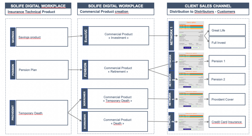 SOLIFE configuration workbench can respond to these challenges. In fact, the configuration of the technical product decoupled from the commercial offer allows a powerfull and flexible configuration to respond to the characteristics of the Savings, Pension and Provident products.
